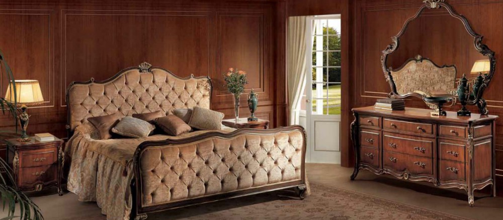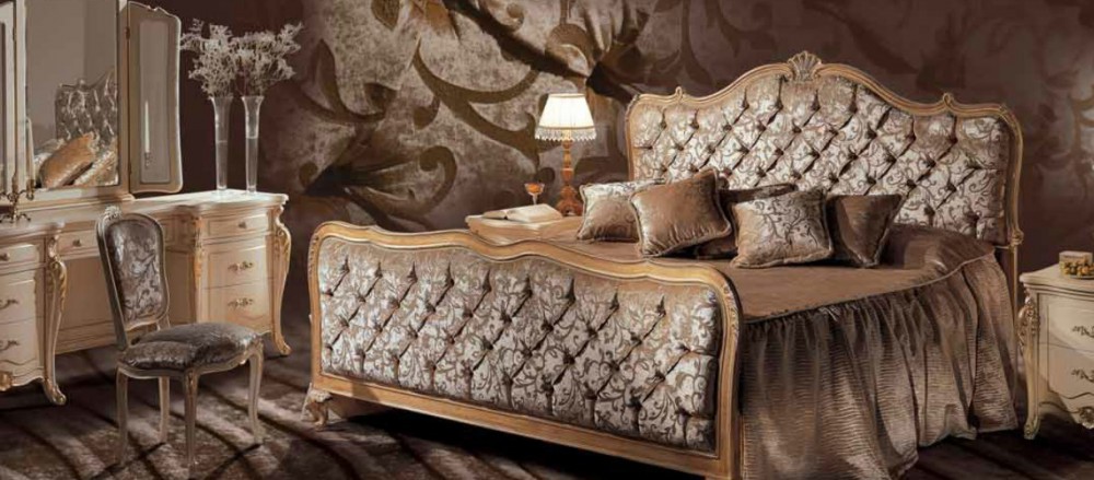 Оригинальная элитная спальня Mahler от фабрики Angelo Cappelini из Италии станет замечательной находкой для поклонников элегантных, стильных интерьеров. Удивительный комфорт, приятные впечатления обеспечивает сочетание нежного светлого кремового оттенка текстиля, которым обиты мягкие изголовье и изножье кровати, и глубокого шоколадного цвета тумбочек, комода. Изысканная позолоченная окантовка, деревянные резные элементы, изящная фурнитура дарят интерьеру некоторые нотки кокетливого шика, подчеркивающего уникальность стильного декора спальни.