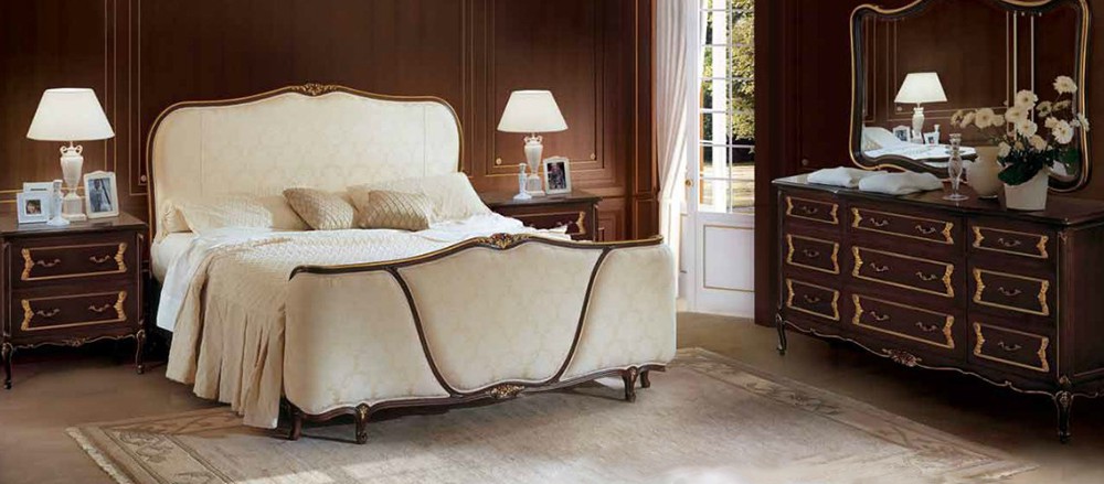 Идеальной гармонией классической элегантности и шика, присущего стилю барокко, отличается спальня Scarlatti от компании Angelo Cappelini из Италии. Глубокие шоколадные оттенки, продуманная конструкция каждого мебельного предмета, придают гарнитуру величавый, респектабельный вид. Замечательным дополнением мягкого изголовья и фигурного изножья кровати, ящиков и боковых панелей тумбочек являются сложные деревянные элементы ручной резьбы, покрытые серебряной фольгой. Элегантной роскошью отличается и оригинальный комод, который венчает фигурное зеркало, обрамленное резьбой. -