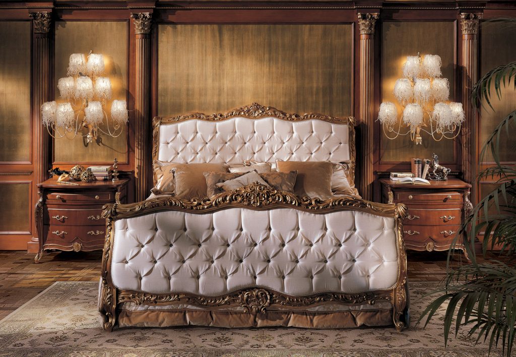 Комфортная, шикарная спальня Respighi от знаменитой компании Angelo Cappelini из Италии достойно украсит престижный, респектабельный дом, создаст идеальные условия для отдыха. Нежная, волшебная гармония дорогих материалов мягкой обивки изголовья и изножья кровати, изысканной позолоченной резьбы обеспечивает интерьеру шик, достойный королевских покоев. Плавные, изогнутые формы мебели, ножек в стиле барокко, растительный орнамент на материале, сложные резные декоративные элементы на ящиках тумбочек и комода радуют глаз, обеспечивают хорошее настроение. -