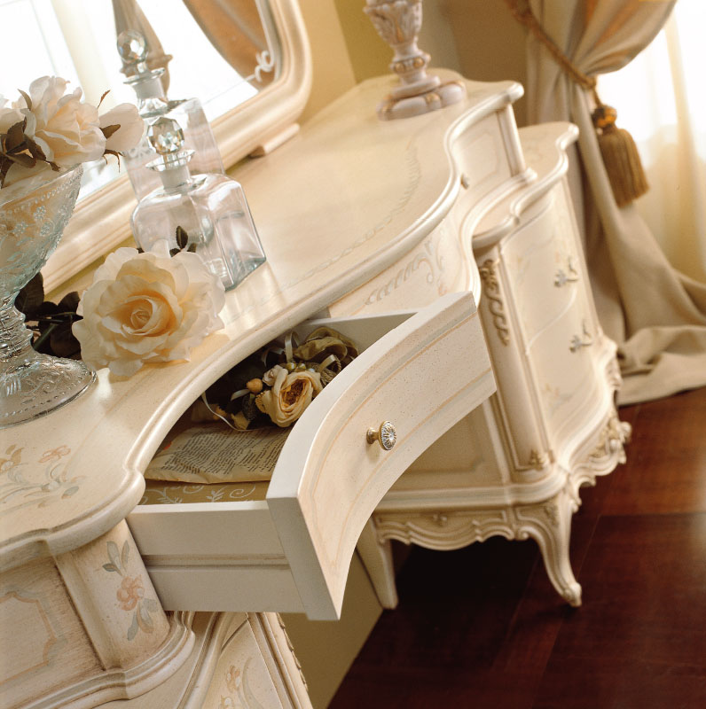 Нежная, изящная спальня Bizet от компании Angelo Cappelini из Италии станет замечательной находкой для почитателей истинного комфорта и элегантной роскоши. Искусная ручная резьба обрамляет сложное, фигурное мягкое изголовье, служит окантовкой основе. Покрытие золоченой фольгой превращает ее в достойное украшение, придает нотки величия гарнитуру. Роскошная ткань обивки и пастельный светлый кремовый оттенок мебели идеально сочетаются друг с другом, обеспечивая спальне сладкую, волшебную негу уюта и тепла. Нежные цвета гарантируют спальне тот чудесный комфорт, который необходим для полноценного отдыха.