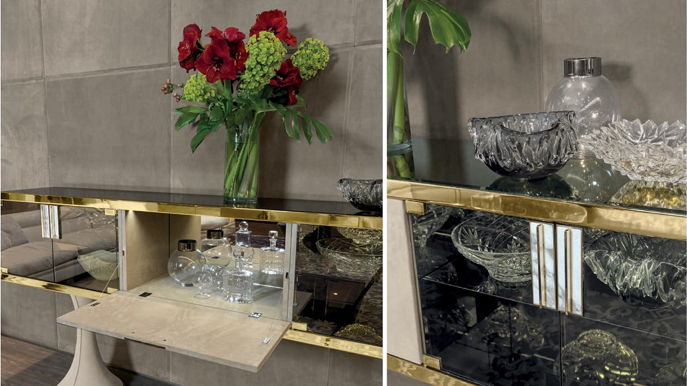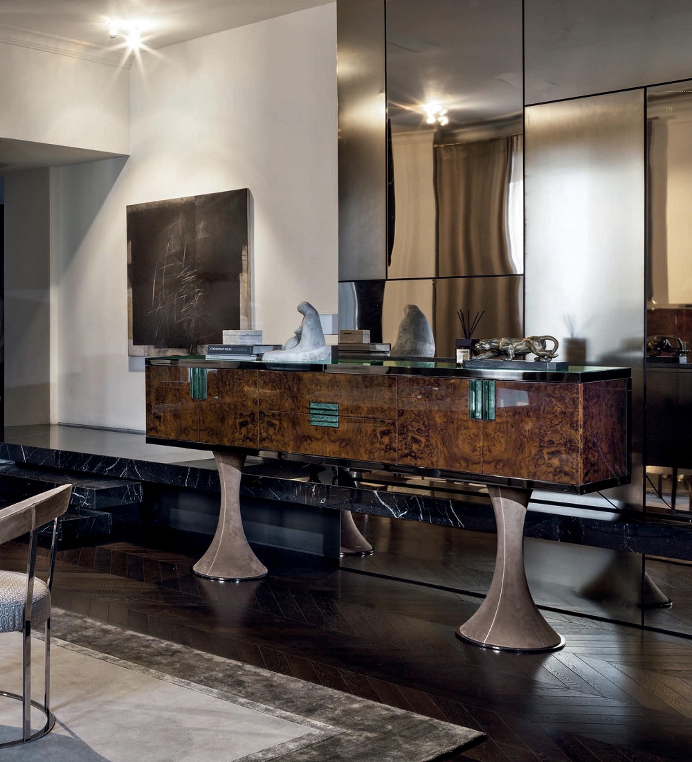 Мебель в тонах синего, глубокого и загадочного, как ночное небо, изящно интерпретирует оригинальные формы. Сумеречные краски вызывают в памяти атмосферу Прекрасной эпохи, дополняемую новым сиянием ценных металлов. Дом модернизирует свой облик в поисках изысканного стиля, основанного на геометрических фантазиях. -