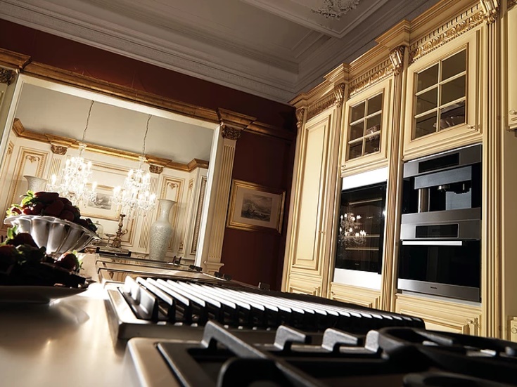 Венцом королевской роскоши и совершенства можно с уверенностью назвать кухню Villa Corallo от итальянского производителя Boiserie Italia. Неповторимая в своём величии и в функциональности эта модель может стать предметом интерьера только у настоящих ценителей искусства. Выполненная в классическом стиле кухня Villa Corallo изготовлена из элитных сортов древесины. Мастера фабрики украсили кремовые фасады ручной резьбой и комбинацией золотой и серебряной патины. Модель имеет многофункциональные шкафы с большим количеством полочек и возможностью для внедрения всей необходимой бытовой техники. -