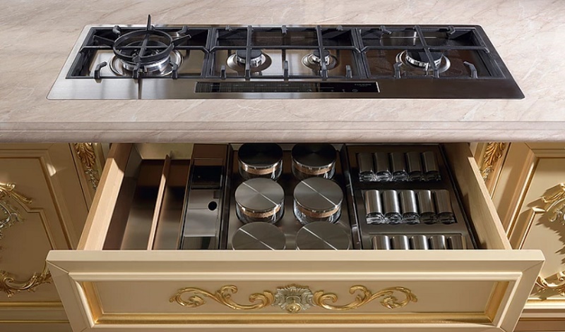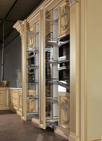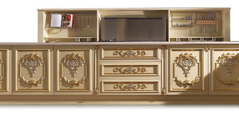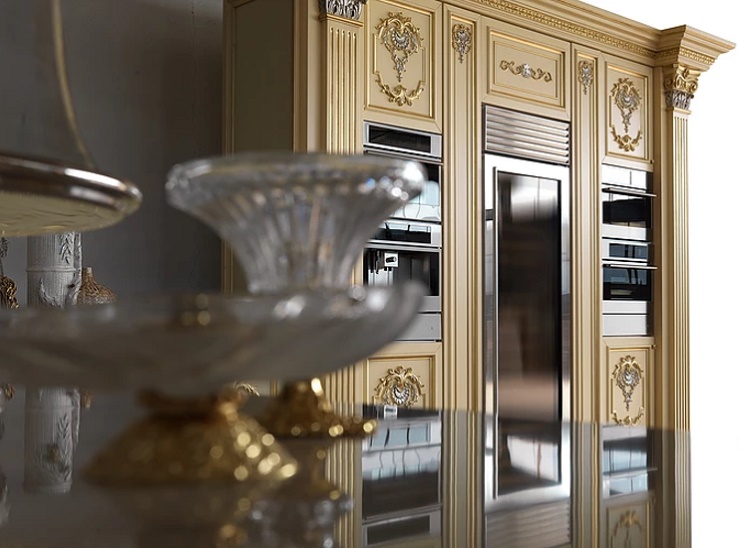 Только высококачественные материалы легли в основу производства изящной и роскошной кухни Princess Helen. Фабрика Boiserie Italia сделала акцент на высокий дворцовый классический стиль, поэтому использует массив дорогой древесины для каркаса и натуральный камень для столешниц. Дизайнеры подчеркнули элегантность гарнитура его цветовым решением. Невероятная ручная резьба от лучших мастеров в сочетании с позолотой выделяет уникальный дизайн фасадов. Кухня Princess Helen включает в себя удобные и большие шкафы с возможностью внедрения в них бытовой техники, а также комфортный стол-«остров». Такая модель по праву может считаться удобной и незаменимой.