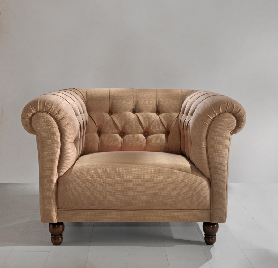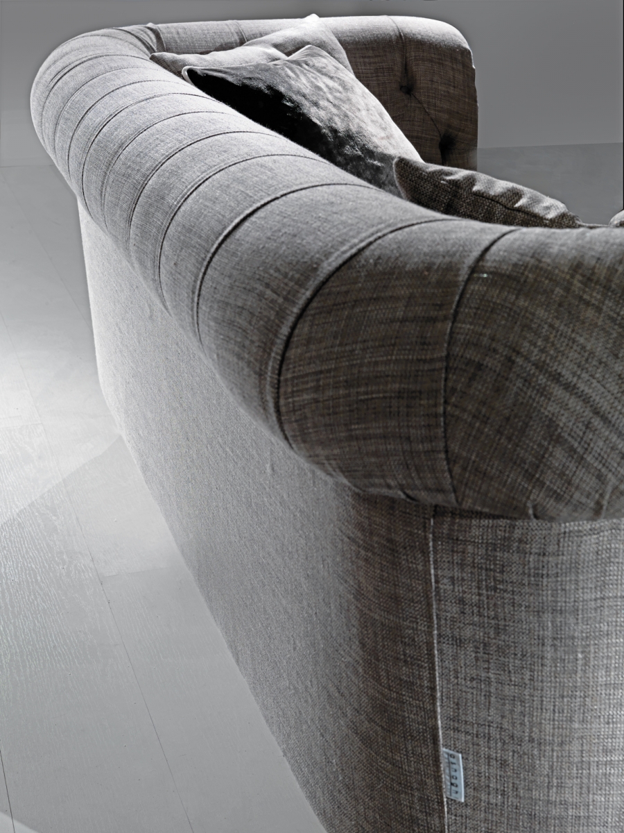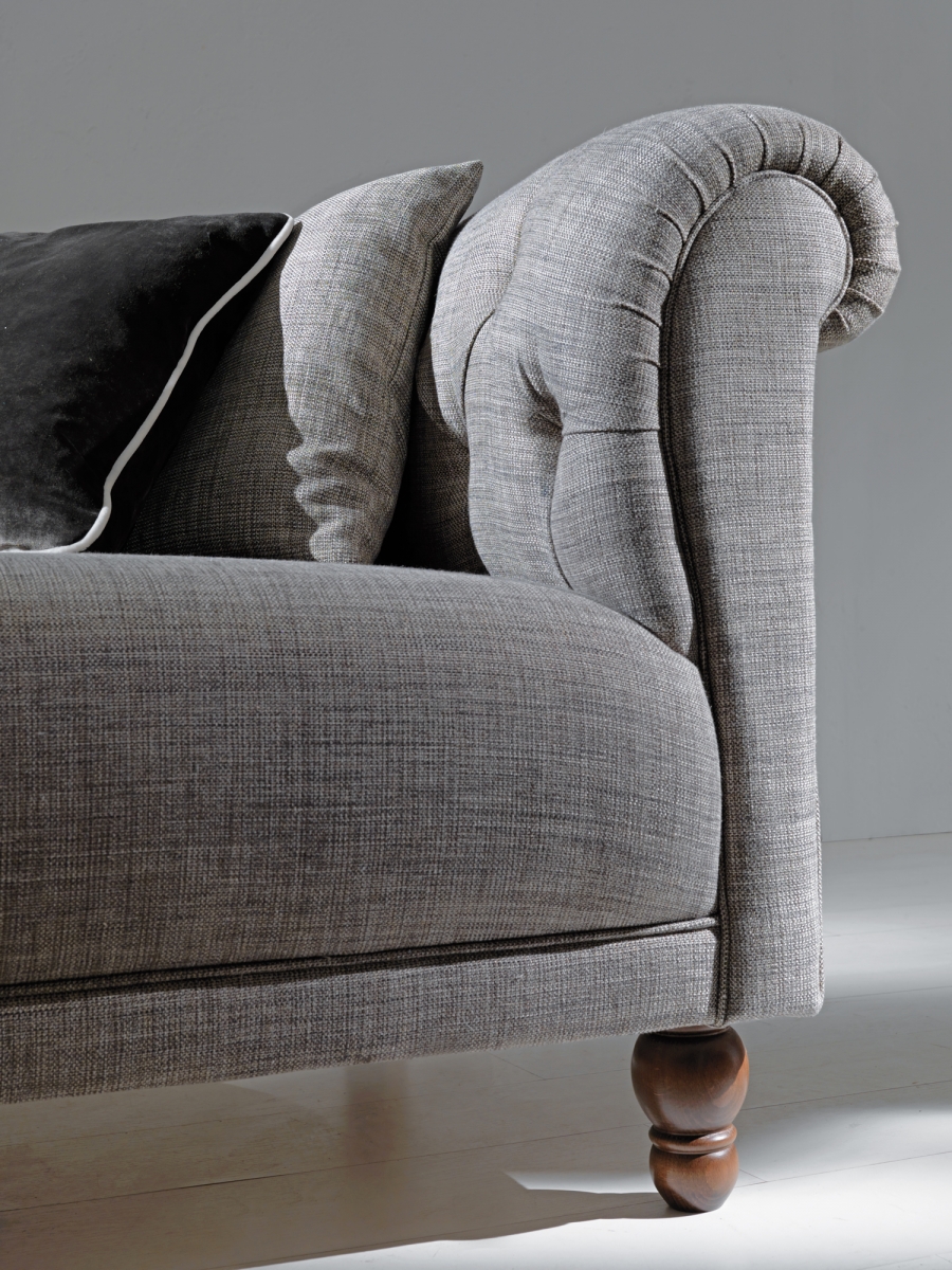 Сосновая рама с эластичной лентой, покрытой пенополиуретаном высокой плотности различной толщины. Подушки для сидения со стерилизованным гусиным пухом и вставкой пенополиуретана средней плотности. Анатомически спроектированные подушки для спинки наполнены стерилизованным гусиным пухом для большего комфорта. Темно-коричневые окрашенные деревянные ножк, полностью съемная тканевая обивка.