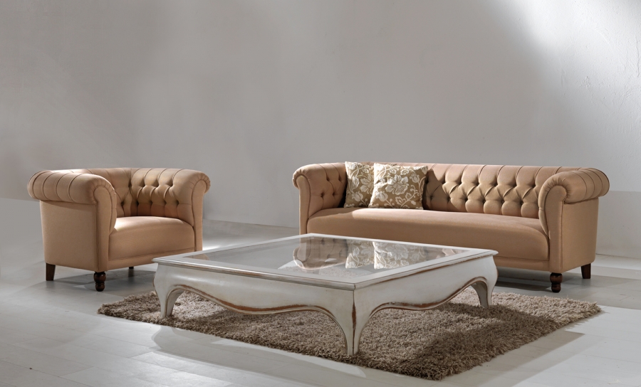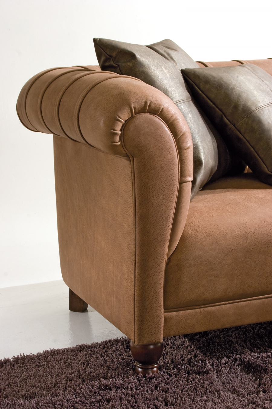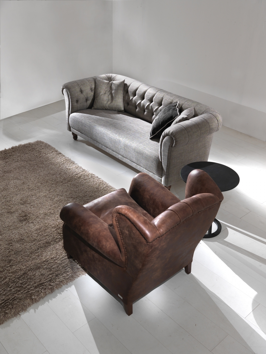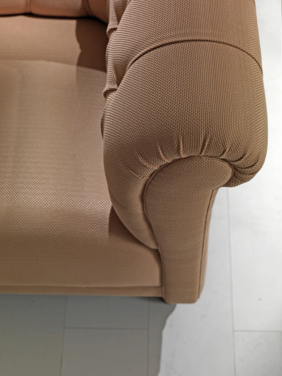 Сосновая рама с эластичной лентой, покрытой пенополиуретаном высокой плотности различной толщины. Подушки для сидения со стерилизованным гусиным пухом и вставкой пенополиуретана средней плотности. Анатомически спроектированные подушки для спинки наполнены стерилизованным гусиным пухом для большего комфорта. Темно-коричневые окрашенные деревянные ножк, полностью съемная тканевая обивка.